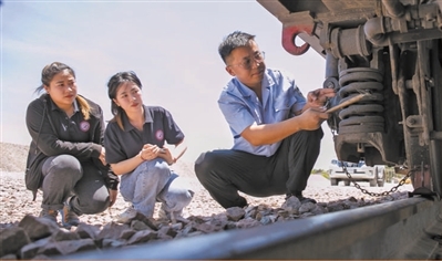 2021年9月,在老挝首都万象北郊的中国中铁二局中老铁路铺轨基地,老挝员工希达·平蓬莎万(中)跟着中国师傅(右)检查列车。