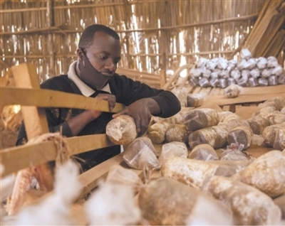 中国福建农林大学的菌草专家长期在卢旺达示范和推广菌草技术。图为2020年9月,在卢旺达首都基加利的一家食用菌培育作坊,作坊主人埃马纽埃尔·阿希马纳检查菌袋。