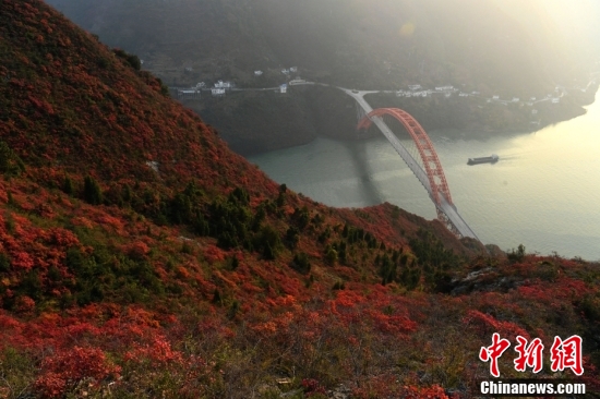 重庆巫山县漫山遍野的红叶与三峡形成一幅“美丽画卷”。中新社记者 陈超 摄