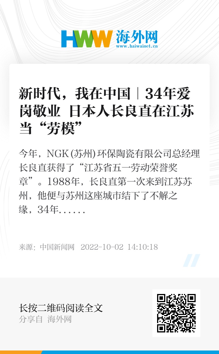今年,NGK(苏州)环保陶瓷有限公司总经理长良直获得了“江苏省五一劳动荣誉奖章”。1988年,长良直第一次来到江苏苏州,他便与苏州这座城市结下了不解之缘,34年的光阴生活,他也亲眼见证了这座城市的变迁。