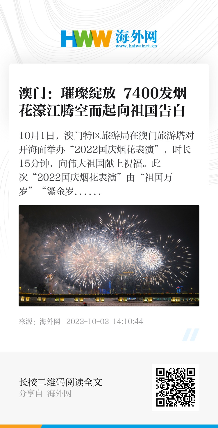 10月1日,澳门特区旅游局在澳门旅游塔对开海面举办“2022国庆烟花表演”,时长15分钟,向伟大祖国献上祝福。此次“2022国庆烟花表演”由“祖国万岁”“鎏金岁月”“同心致远”及“共筑中国梦”四个篇章组成,约7400发不同种类的烟花腾空而起,填满夜空,通过璀璨的烟火礼谱写澳门与祖国携手共进、迈向新篇章的美好愿景。来源:视觉中国