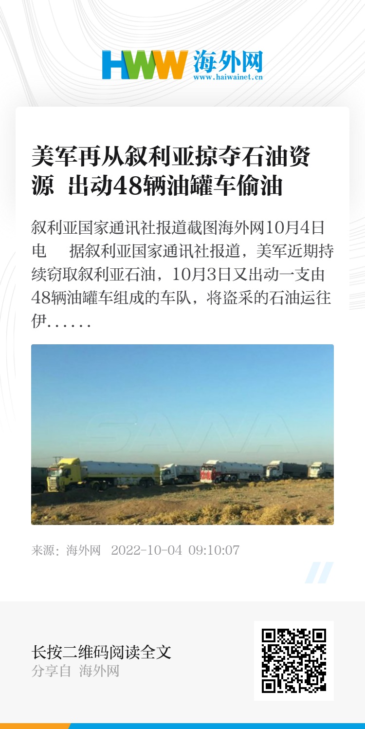 海外网10月4日电 据叙利亚国家通讯社报道,美军近期持续窃取叙利亚石油,10月3日又出动一支由48辆油罐车组成的车队,将盗采的石油运往伊拉克。