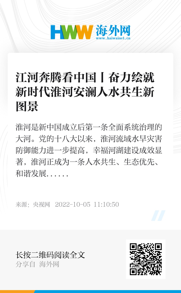 淮河是新中国成立后第一条全面系统治理的大河。党的十八大以来,淮河流域水旱灾害防御能力进一步提高,幸福河湖建设成效显著,淮河正成为一条人水共生、生态优先、和谐发展的幸福之河。