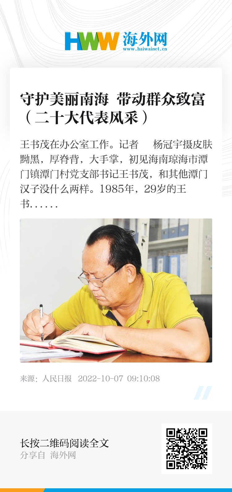 “改革先锋”、“最美奋斗者”、“七一勋章”、全国劳动模范……一项项荣誉见证着王书茂与海洋相伴的40多个春秋。如今,他当选为党的二十大代表。“我要用我的一生守护南海,让南海越来越美丽,乡亲们的日子越过越好。”王书茂说。(记者 孙海天)