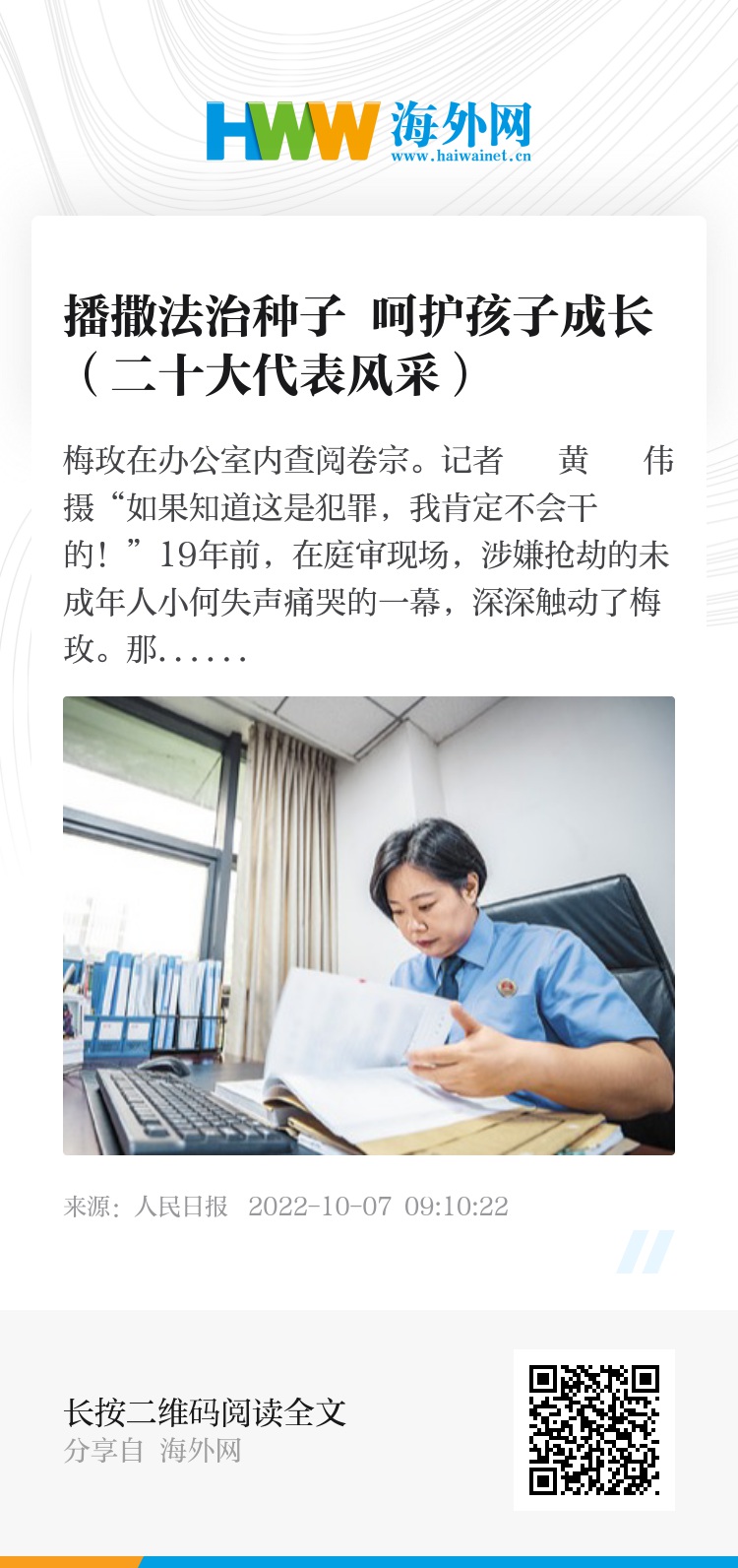 “我不仅要学习好、落实好党的政策,更要把这些传递给更多未成年人,帮助他们树立正确的价值观。”当选党的二十大代表,如今已是大渡口区人民检察院高级检察官的梅玫感到肩上的担子更重了。“我愿一直做少年们心中值得信任的检察官,守护他们成长……”梅玫动情地说。(记者 常碧罗)