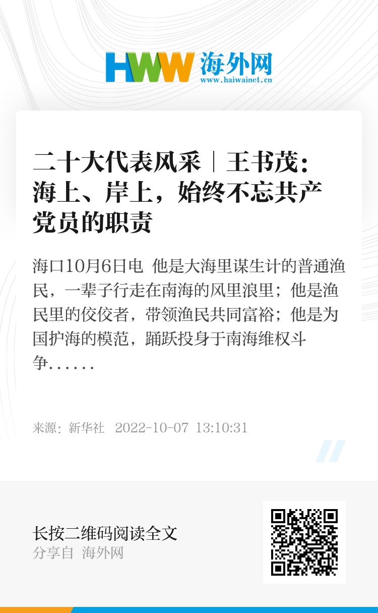 当选党的二十大代表后,王书茂广泛收集群众呼声和建议。他说:“没有党、没有南海就没有我今天,我将继续带领乡亲们保护好我们的‘祖宗海’,发展产业,共同致富。”(新华社记者赵叶苹)