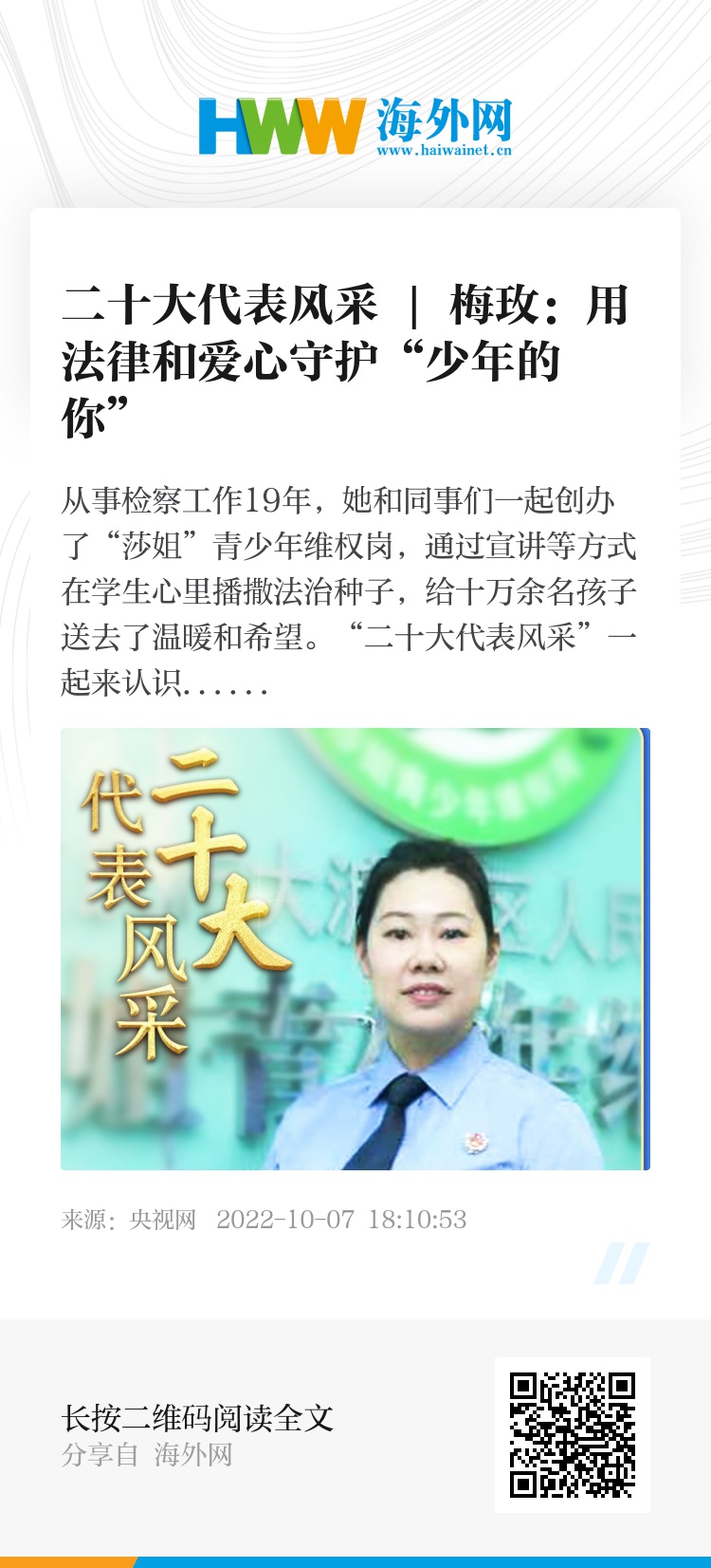 “二十大代表风采”一起来认识重庆市大渡口区检察院检察官梅玫。