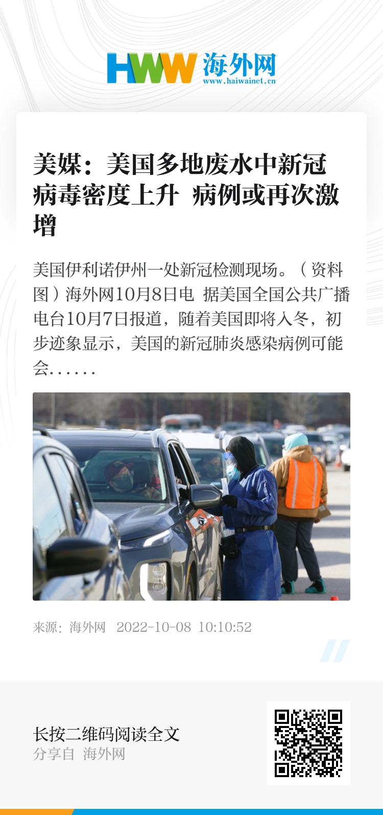 海外网10月8日电 据美国全国公共广播电台10月7日报道,随着美国即将入冬,初步迹象显示,美国的新冠肺炎感染病例可能会再次激增。