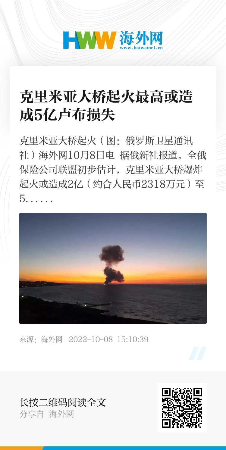 海外网10月8日电 据俄新社报道,全俄保险公司联盟初步估计,克里米亚大桥爆炸起火或造成2亿(约合人民币2318万元)至5亿卢布(约合人民币5796万元)损失。
