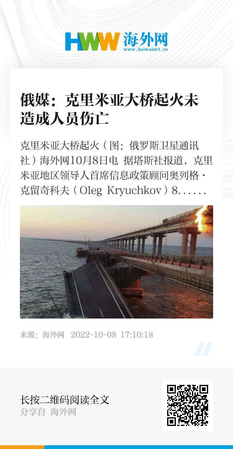 海外网10月8日电 据塔斯社报道,克里米亚地区领导人首席信息政策顾问奥列格·克留奇科夫(Oleg Kryuchkov)8日表示,初步消息显示,克里米亚大桥起火并未造成人员伤亡。