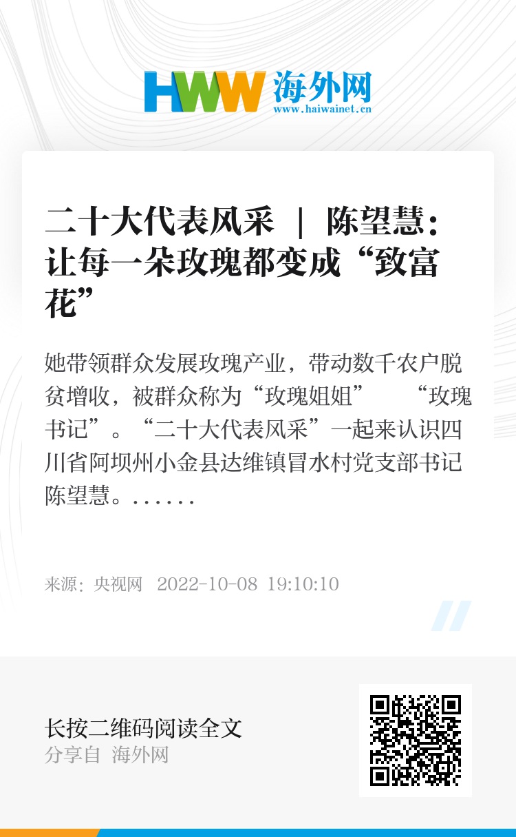 “二十大代表风采”一起来认识四川省阿坝州小金县达维镇冒水村党支部书记陈望慧。