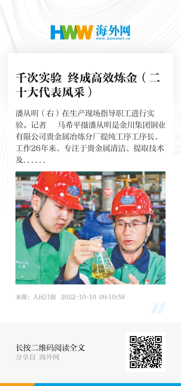 潘从明是金川集团铜业有限公司贵金属冶炼分厂提纯工序工序长,工作26年来,专注于贵金属清洁、提取技术及装备的研发与应用。“我的爱好就是我的工作。”潘从明说。