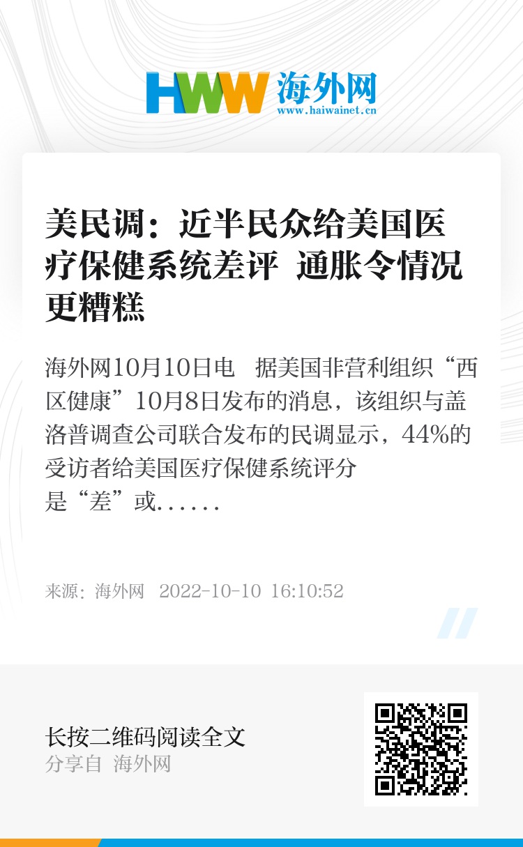 海外网10月10日电 据美国非营利组织“西区健康”10月8日发布的消息,该组织与盖洛普调查公司联合发布的民调显示,44%的受访者给美国医疗保健系统评分是“差”或“不及格”。