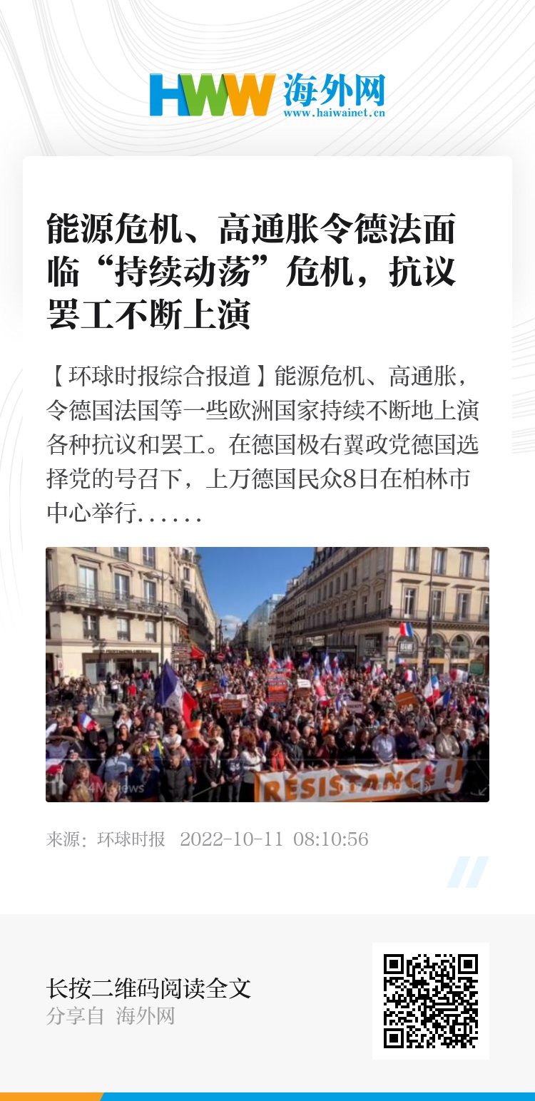 【环球时报综合报道】能源危机、高通胀,令德国法国等一些欧洲国家持续不断地上演各种抗议和罢工。在德国极右翼政党德国选择党的号召下,上万德国民众8日在柏林市中心举行示威游行,抗议德国政府的能源政策以及高通货膨胀。与此同时,为抗议能源行业员工未能从公司超额利润中获得实际利益,法国炼油厂工人发起的大罢工仍在继续。
