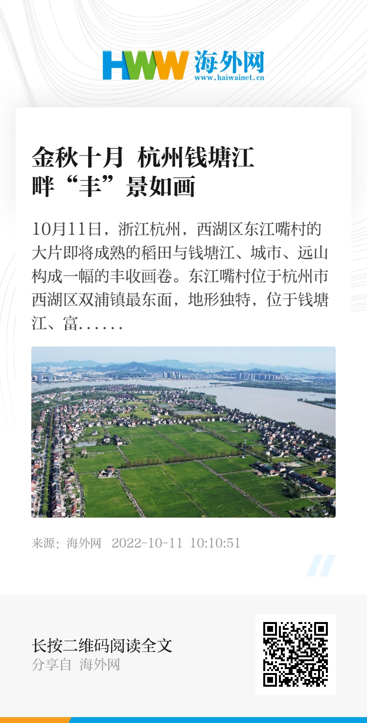 10月11日,浙江杭州,西湖区东江嘴村的大片即将成熟的稻田与钱塘江、城市、远山构成一幅的丰收画卷。东江嘴村位于杭州市西湖区双浦镇最东面,地形独特,位于钱塘江、富春江、浦阳江三江交汇处,全村呈月牙半岛形态,是浙江省善治示范村。来源:IC photo