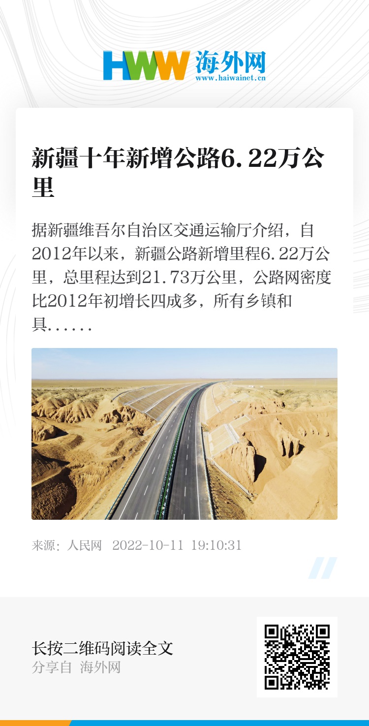 据新疆维吾尔自治区交通运输厅介绍,自2012年以来,新疆公路新增里程6.22万公里,总里程达到21.73万公里,公路网密度比2012年初增长四成多,所有乡镇和具备条件的建制村全部通硬化路。