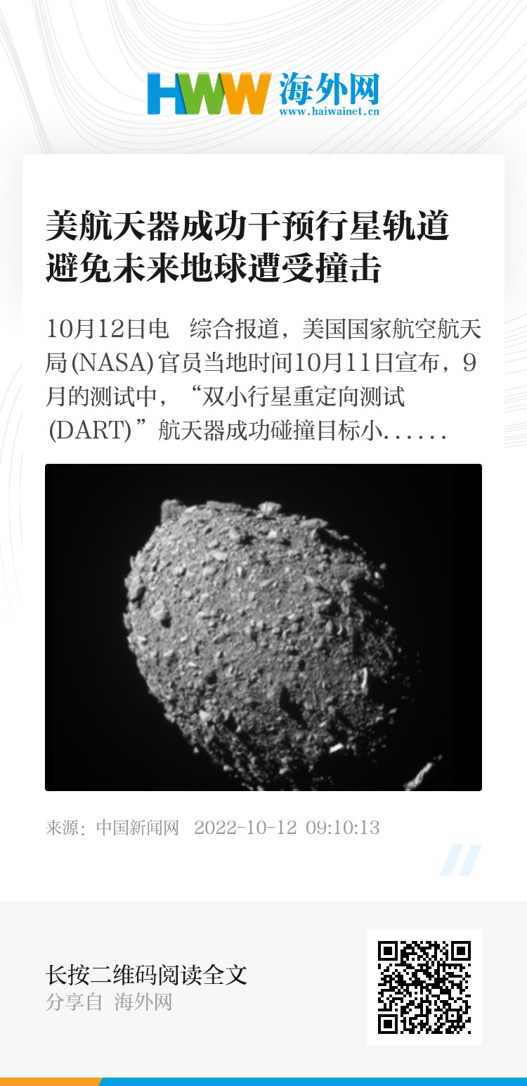 中新网10月12日电 综合报道,美国国家航空航天局(NASA)官员当地时间10月11日宣布,9月的测试中,“双小行星重定向测试(DART)”航天器成功碰撞目标小行星,并改变其原有运行轨道。