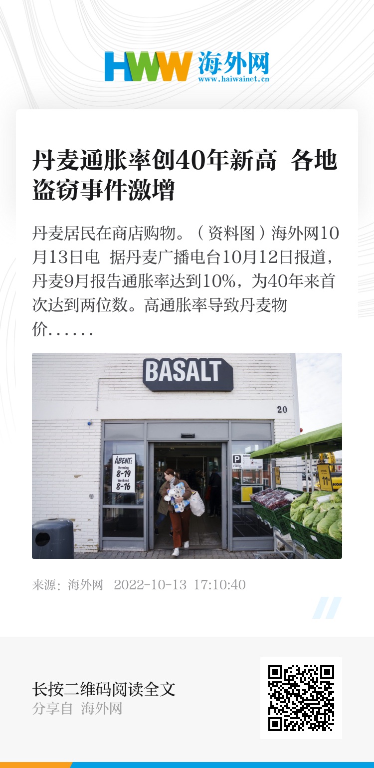 海外网10月13日电 据丹麦广播电台10月12日报道,丹麦9月报告通胀率达到10%,为40年来首次达到两位数。高通胀率导致丹麦物价飙升,各地商店的盗窃事件激增。