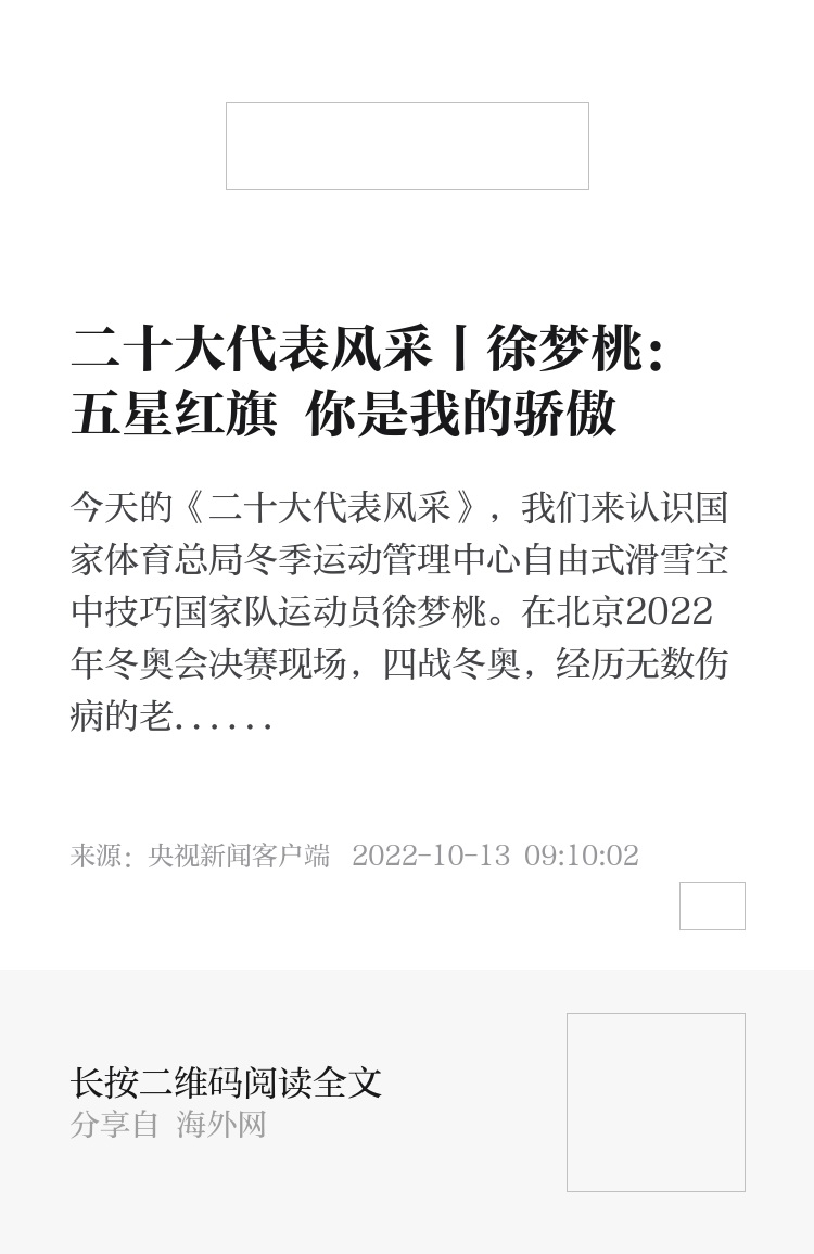国家体育总局冬季运动管理中心自由式滑雪空中技巧国家队运动员 徐梦桃:习近平总书记寄语我们运动员:“人生能有几回搏,拼搏是值得的。”我会牢记总书记的嘱托,作为一名党的二十大代表,我倍感责任重大,使命光荣。我会用自己的努力在岗位上做出更好的成绩,用实际行动迎接党的二十大胜利召开。