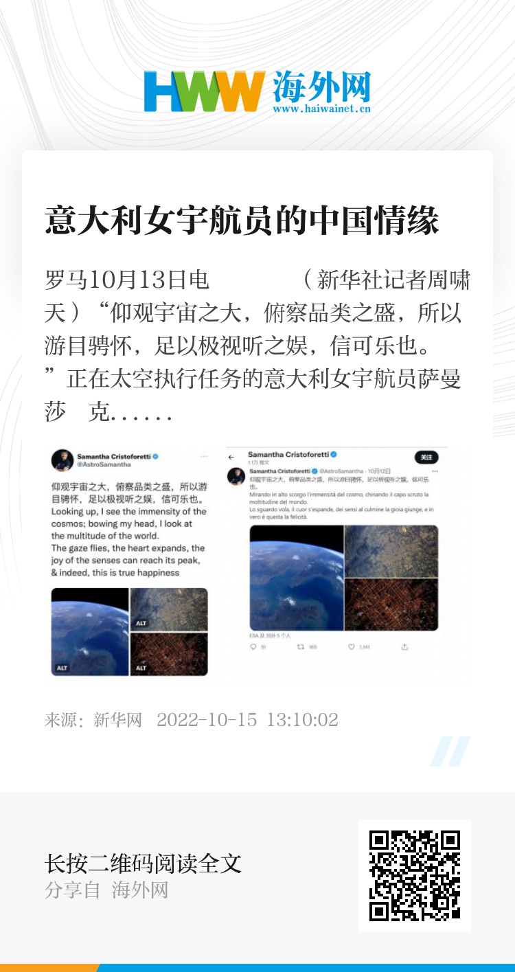 新华社罗马10月13日电 (新华社记者周啸天)“仰观宇宙之大,俯察品类之盛,所以游目骋怀,足以极视听之娱,信可乐也。”正在太空执行任务的意大利女宇航员萨曼莎・克里斯托福雷蒂日前在社交媒体引用中国东晋时期书法家王羲之《兰亭集序》的名句,表达在太空的所见与所想,并配有从太空中拍摄的中国风景照片,引不少网友赞叹。