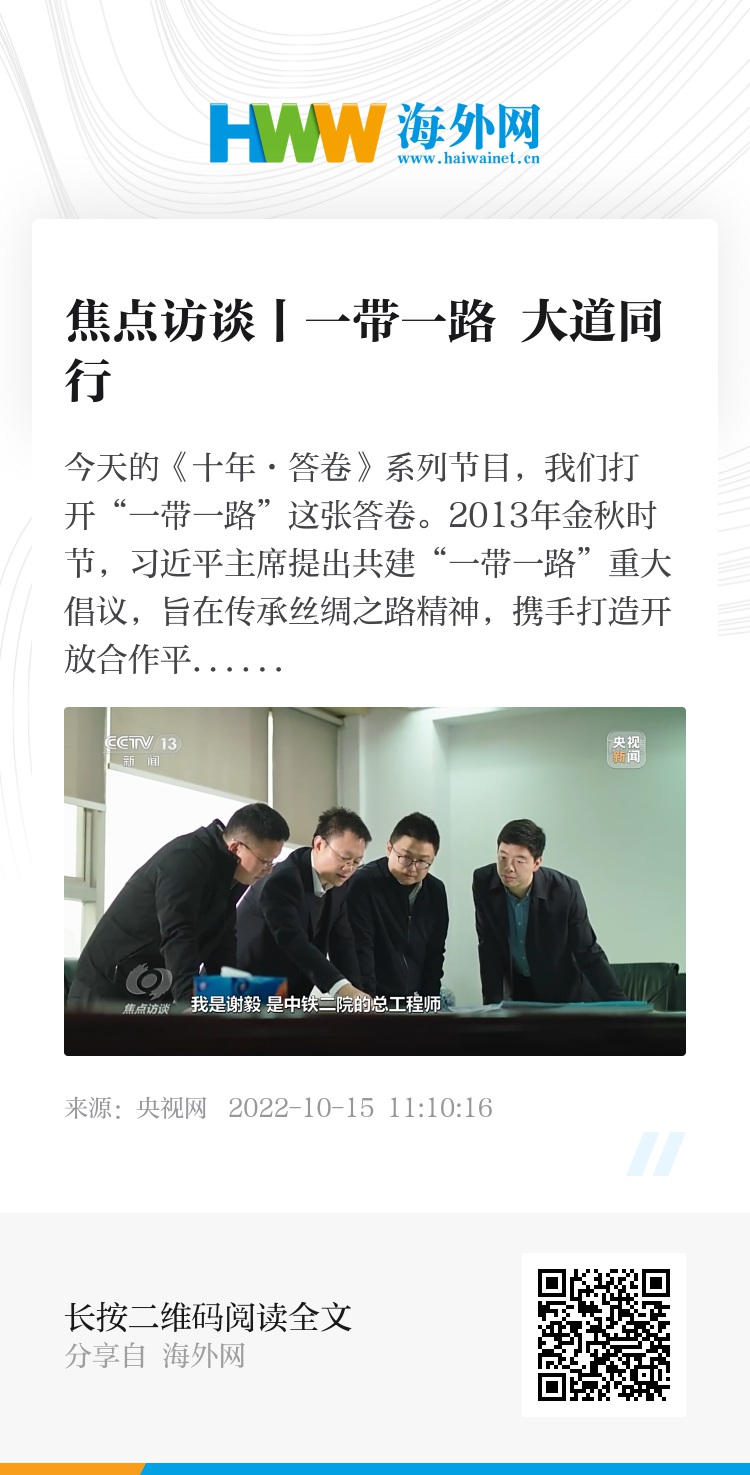今天的《十年·答卷》系列节目,我们打开“一带一路”这张答卷。2013年金秋时节,习近平主席提出共建“一带一路”重大倡议,旨在传承丝绸之路精神,携手打造开放合作平台,为各国合作发展开创新机遇,谋求新动力,拓展新空间。倡议源于中国,但机会和成果属于世界。9年来,共建“一带一路”一步步走深走实,成了各国共同的机遇之路,繁荣之路,也成了推动构建人类命运共同体的重要实践平台。它是如何做到的,又给中国和世界带来了什么?