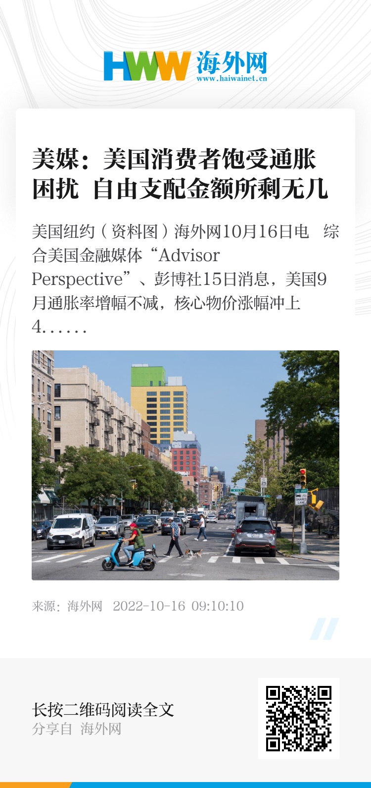海外网10月16日电 综合美国金融媒体“Advisor Perspective”、彭博社15日消息,美国9月通胀率增幅不减,核心物价涨幅冲上40年来最高位。美媒认为,美国消费者正在承受“猖獗上涨”的价格带来的重压,因为他们在生活必需品上花了很多钱,让其它可自由支配的购物金额所剩无几。