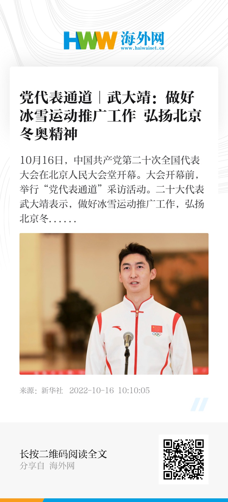 10月16日,中国共产党第二十次全国代表大会在北京人民大会堂开幕。大会开幕前,举行“党代表通道”采访活动。二十大代表武大靖表示,做好冰雪运动推广工作,弘扬北京冬奥精神。