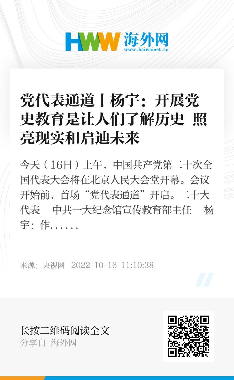 二十大代表 中共一大纪念馆宣传教育部主任 杨宇:作为党史教育工作者,我想说,我们做好党史教育是为了让人们了解历史、照亮现实和启迪未来。说到工作上的细节,我认为去年的一场接待值得分享。去年是建党百年,在6月16日这天我接待了一批外国参访者,其中包括了40多个国家的驻华大使,我的讲解就是围绕着“马克思主义为什么行”“中国共产党为什么能”“中国特色社会主义为什么好”而展开的。在讲到“全面小康”这个版面的时候,收获了一片掌声,我以为是我的讲解得到了认可。参观结束后在交流的时候,加蓬驻华大使说,中国共产党一心为了人民,为了人民更好的生活,取得了令世界瞩目的脱贫成绩。阿尔巴尼亚大使也说,在他看来没有哪个马克思主义政党像中国共产党这样成功。