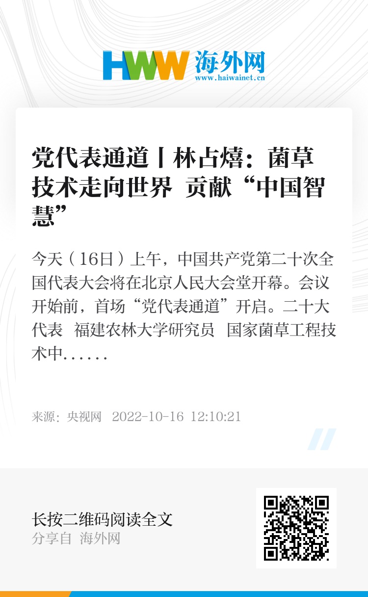 二十大代表 福建农林大学研究员 国家菌草工程技术中心首席科学家 林占熺:菌草技术走向世界,我印象最深的是援外第一站巴布亚新几内亚东高地省。20多年前,那里还处在刀耕火种的部落经济状态中,如何让他们掌握菌草这一现代生物技术,这是我们遇到的一大难题。我们因地制宜、因陋就简,把技术本土化、简便化,让村民一看就懂、一学就会、一做就成,获得成功。他们为了庆祝菌草技术示范成功,举行了非常隆重的现场会,巴新总督、9位部长、五千多人从全国各地赶来参会,他们载歌载舞,高呼“China菌草、菌草China”。为了记住来自中国的帮助,一位部长把自己女儿的名字改叫“菌草”,而且特地登报公布。此后,从南太到非洲、拉美,许多人通过种菌草、种菇,摆脱了贫困,改变了他们的命运。