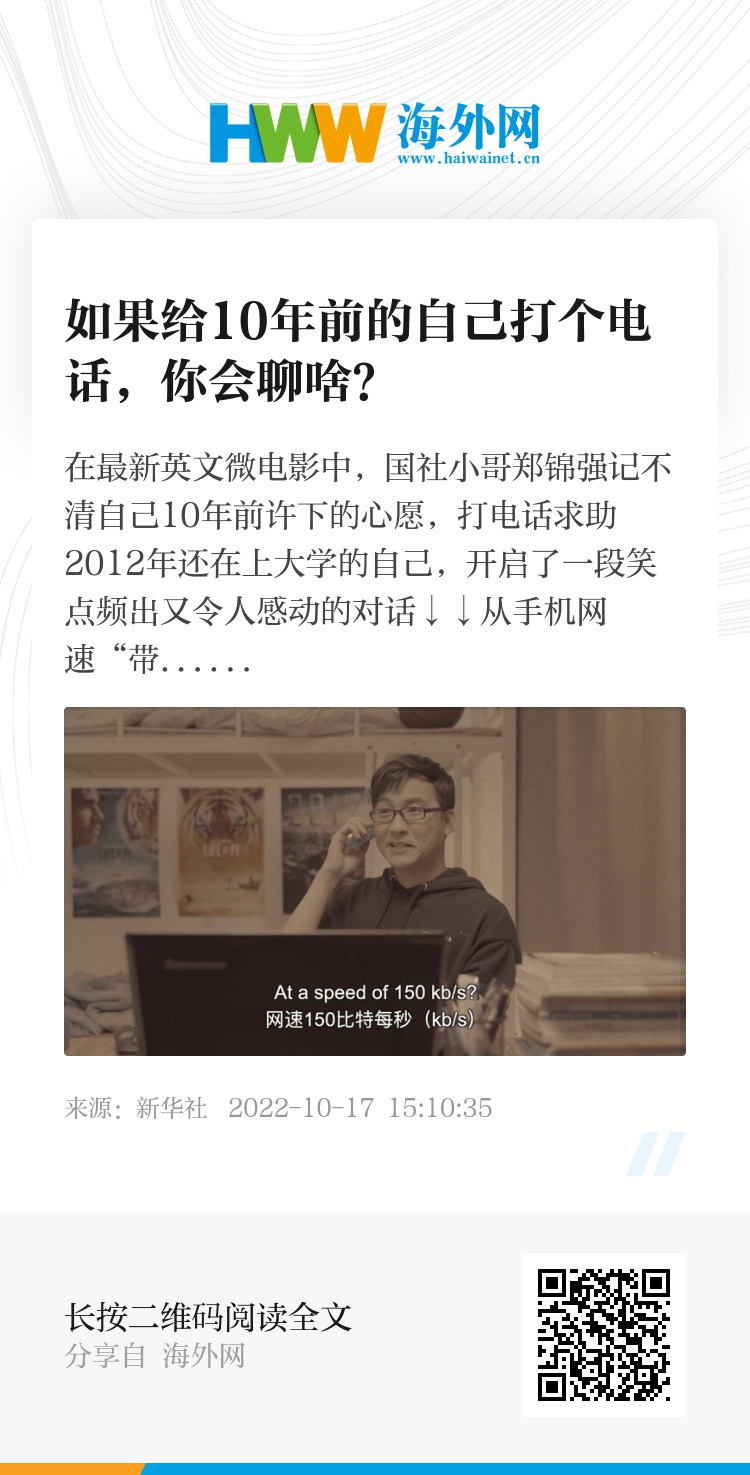 在新华社最新英文微电影中,国社小哥郑锦强记不清自己10年前许下的心愿,打电话求助2012年还在上大学的自己,开启了一段笑点频出又令人感动的对话↓↓