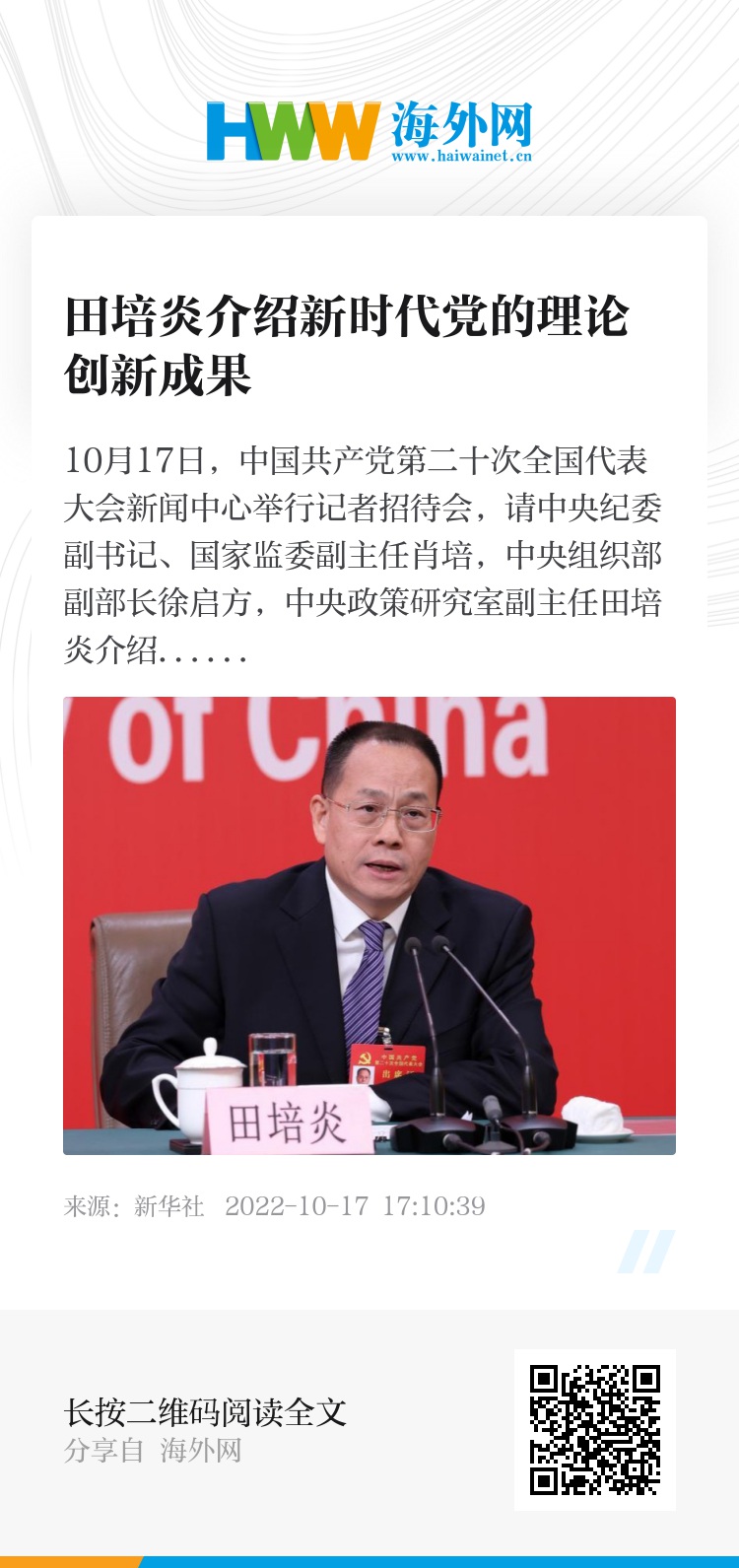 10月17日,中国共产党第二十次全国代表大会新闻中心举行记者招待会,请中央纪委副书记、国家监委副主任肖培,中央组织部副部长徐启方,中央政策研究室副主任田培炎介绍坚定不移全面从严治党,深入推进新时代党的建设新的伟大工程有关情况,并回答记者提问。在记者招待会上,田培炎介绍了新时代党的理论创新成果。