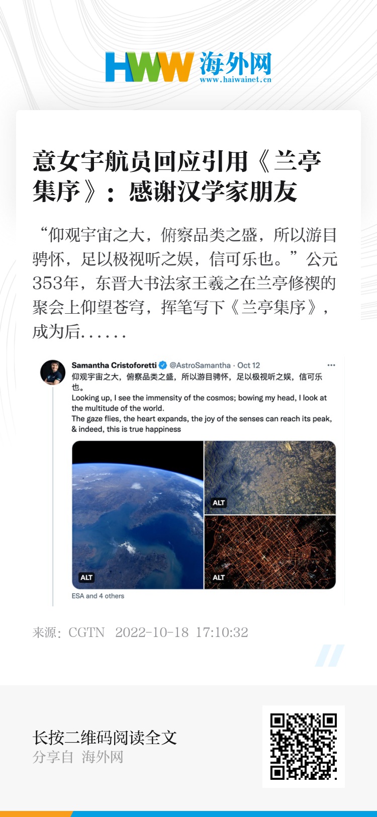 克里斯托福雷蒂12日在她的推特账号上发布了这句中国人耳熟能详的古文,并附上了英语和意大利语译文,以及拍摄自空间站的渤海湾和北京市的照片。