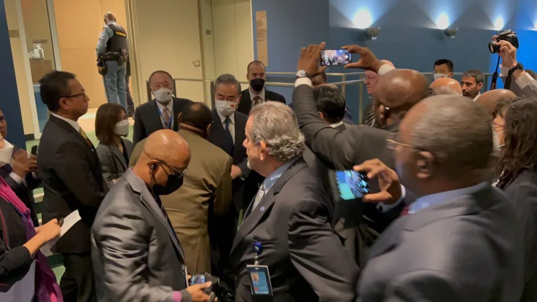 ▲ 2022年9月24日,在第77届联合国大会一般性辩论中方发言结束后,多国代表等候与国务委员兼外长王毅握手交流,表示对中国倡议的支持和认可。