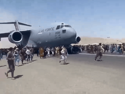 ▲ 2021年8月,数千名阿富汗人涌入喀布尔卡尔扎伊国际机场跑道,试图追逐并登上正要起飞的美军C-17运输机。