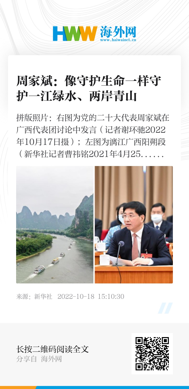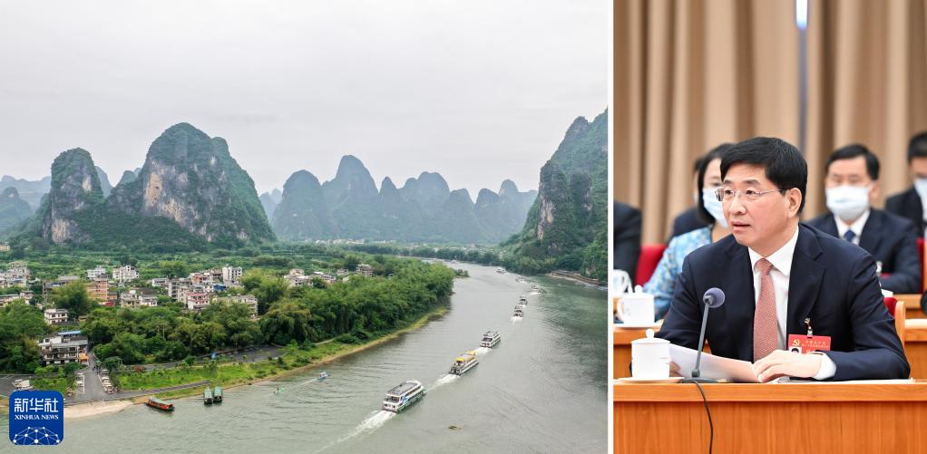 拼版照片:右图为党的二十大代表周家斌在广西代表团讨论中发言(新华社记者谢环驰2022年10月17日摄);左图为漓江广西阳朔段(新华社记者曹祎铭2021年4月25日摄)。