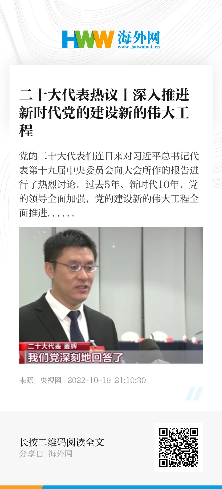 二十大代表 李明俊:我们在基层也有深切的体会,基础不牢,地动山摇。我们在阵地建设上,每个村建设不低于300平方(米)的党群服务中心,把基层党建产业发展、生态文明、乡风文明建设融入五星党支部的建设中,传承弘扬焦裕禄精神,鼓励基层干部在一线建功立业,努力在脱贫地区率先实现共同富裕的道路上,走在前,做表率。