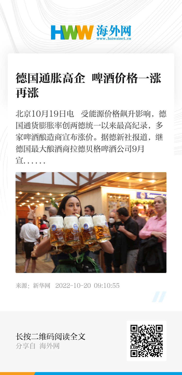 新华社北京10月19日电 受能源价格飙升影响,德国通货膨胀率创两德统一以来最高纪录,多家啤酒酿造商宣布涨价。