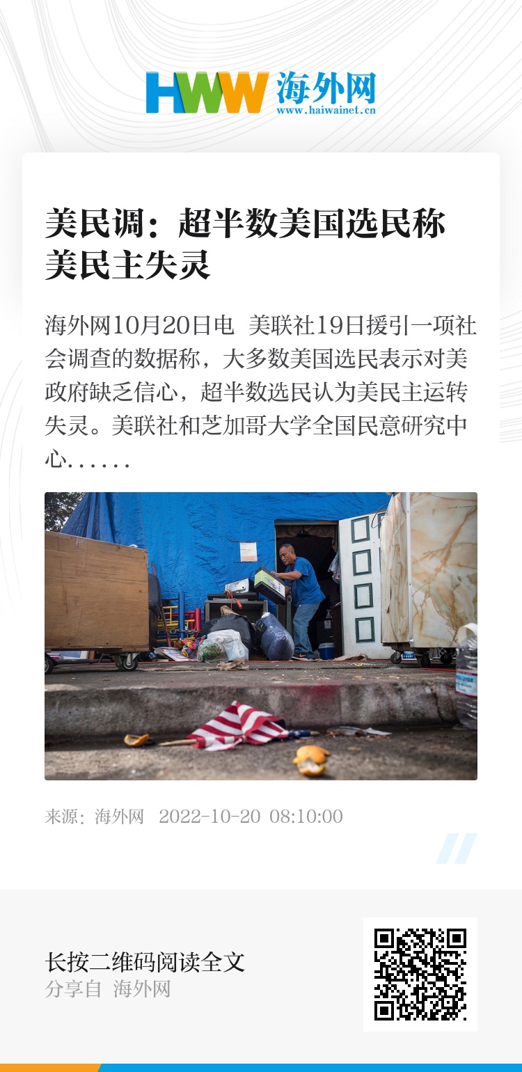 海外网10月20日电 美联社19日援引一项社会调查的数据称,大多数美国选民表示对美政府缺乏信心,超半数选民认为美民主运转失灵。