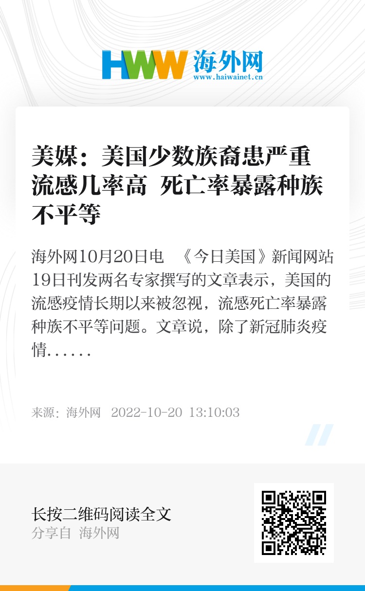 海外网10月20日电 《今日美国》新闻网站19日刊发两名专家撰写的文章表示,美国的流感疫情长期以来被忽视,流感死亡率暴露种族不平等问题。