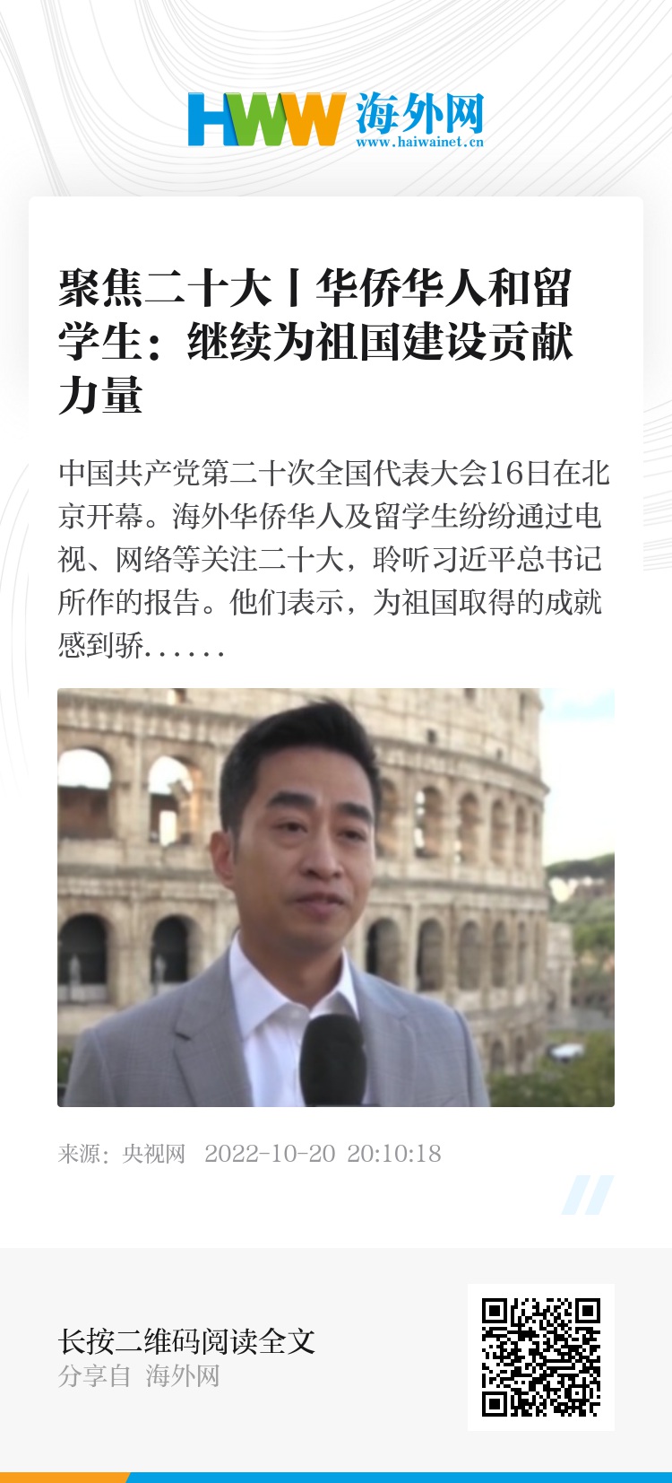 意大利华侨华人青年会负责人 曾步锋:我们坚信在下一个百年奋斗目标中,中国共产党能够带领我们中国人民走向更高的成就,能够实现中华民族伟大复兴的中国梦,能够实现中国现代化建设。我们海外华侨华人也会发挥“桥”的力量,向当地人民讲好中国故事,为中国的建设添砖加瓦,作出自己的贡献。
