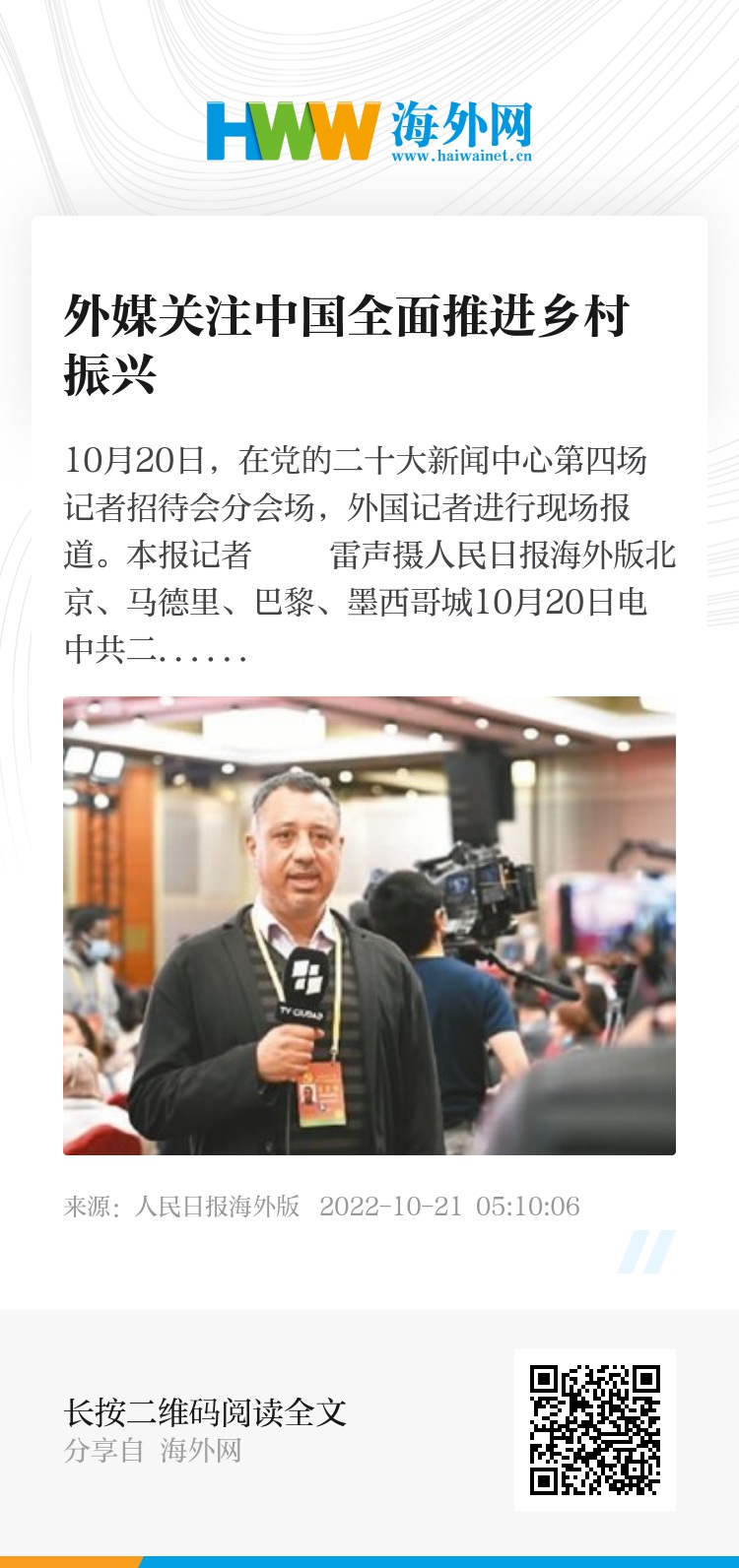 人民日报海外版北京、马德里、巴黎、墨西哥城10月20日电 中共二十大报告提出,全面推进乡村振兴。坚持农业农村优先发展,坚持城乡融合发展,畅通城乡要素流动。今年上半年,中国农业农村经济保持良好发展势头。脱贫地区特色产业稳步发展,产业带动就业增收能力增强。乡村富民产业稳定发展,农村就业增收渠道不断拓宽。外媒持续关注中国全面推进乡村振兴,报道中国农村地区通过发展乡村旅游、特色产业、农村电商等取得的脱贫致富成就。