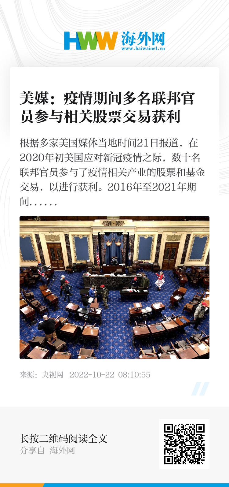 据悉,联邦官员被禁止从事与他们有个人经济利益关系的工作,而且不允许他们利用在工作中获得的非公开信息进行交易。(央视记者 许弢)