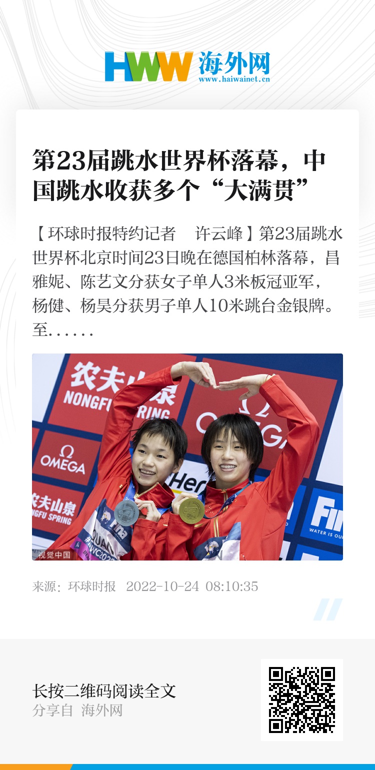 【环球时报特约记者 许云峰】第23届跳水世界杯北京时间23日晚在德国柏林落幕,昌雅妮、陈艺文分获女子单人3米板冠亚军,杨健、杨昊分获男子单人10米跳台金银牌。至此,本届世界杯的8个奥运项目(非奥项目为混合团体赛,中国队并未参加)金牌全部被中国队拿下。这也意味着,从2022年布达佩斯世界游泳锦标赛到本届世界杯,中国跳水“梦之队”在4个月内的两项世界大赛中实现“参赛项目全部夺金”。