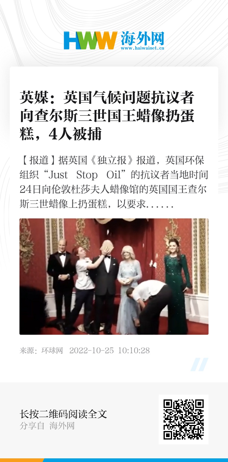 《卫报》称,往查尔斯三世蜡像的脸上扣蛋糕是这个环保激进组织的一系列抗议活动的一环。《独立报》举例称,该组织的抗议者此前在英国国家美术馆向梵高名画《向日葵》泼番茄汤。