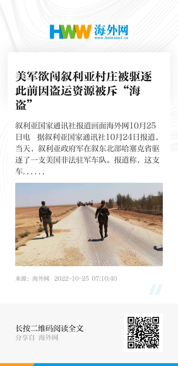 海外网10月25日电 据叙利亚国家通讯社10月24日报道,当天,叙利亚政府军在叙东北部哈塞克省驱逐了一支美国非法驻军车队。报道称,这支车队由5辆军用装甲车组成,试图通过哈塞克省边境重镇卡米什利的一个村庄,随后被位于检查站的叙政府军驱逐出该地区。