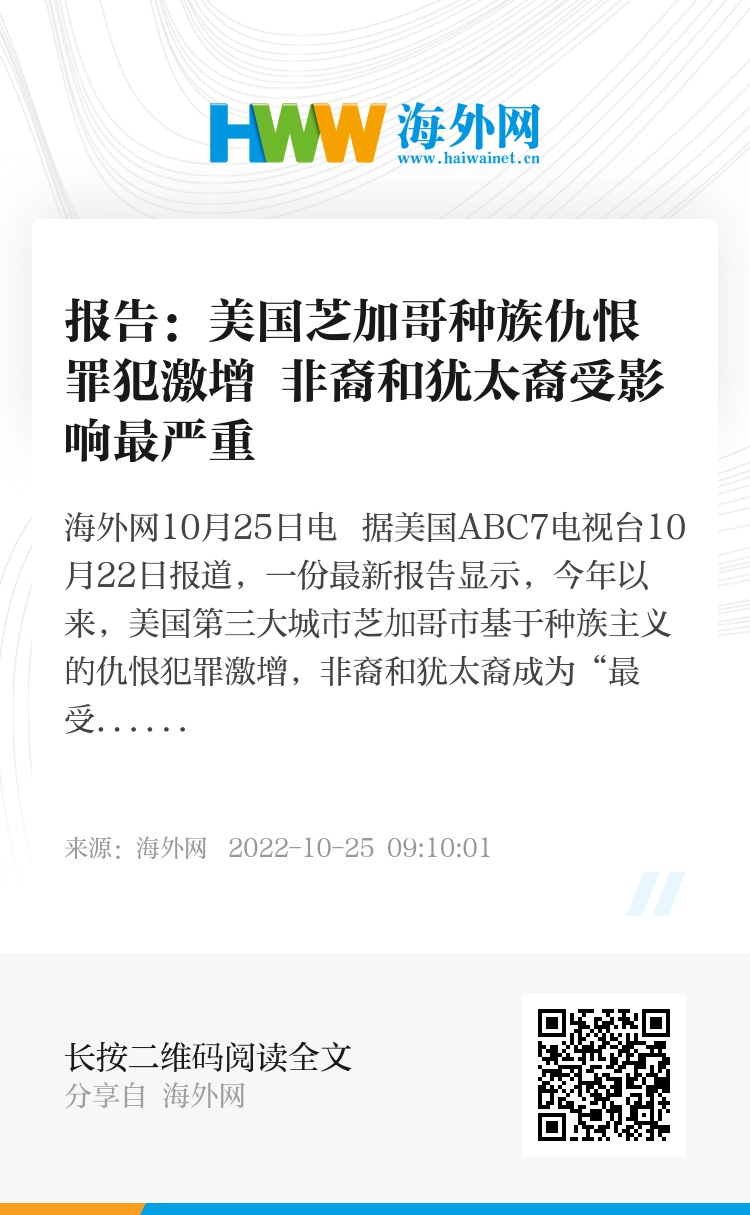 海外网10月25日电 据美国ABC7电视台10月22日报道,一份最新报告显示,今年以来,美国第三大城市芝加哥市基于种族主义的仇恨犯罪激增,非裔和犹太裔成为“最受伤”的两个群体。