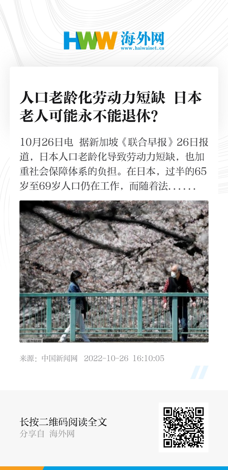 中新网10月26日电 据新加坡《联合早报》26日报道,日本人口老龄化导致劳动力短缺,也加重社会保障体系的负担。在日本,过半的65岁至69岁人口仍在工作,而随着法定退休年龄一再上调,日本老人最终可能永不退休。