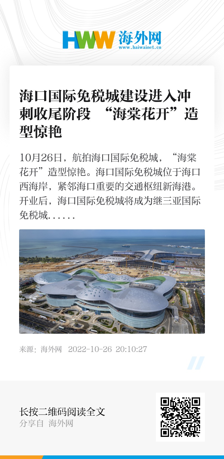 10月26日,航拍海口国际免税城,“海棠花开”造型惊艳。海口国际免税城位于海口西海岸,紧邻海口重要的交通枢纽新海港。开业后,海口国际免税城将成为继三亚国际免税城之后世界最大单体免税店,也将成为海南自贸港建设标志性项目之一。据了解,项目总占地面积约45万平方米,总建筑面积约92.6万平方米,是集免税商业、办公、休闲、文旅等为一体的世界级度假型商业街区。来源:视觉中国