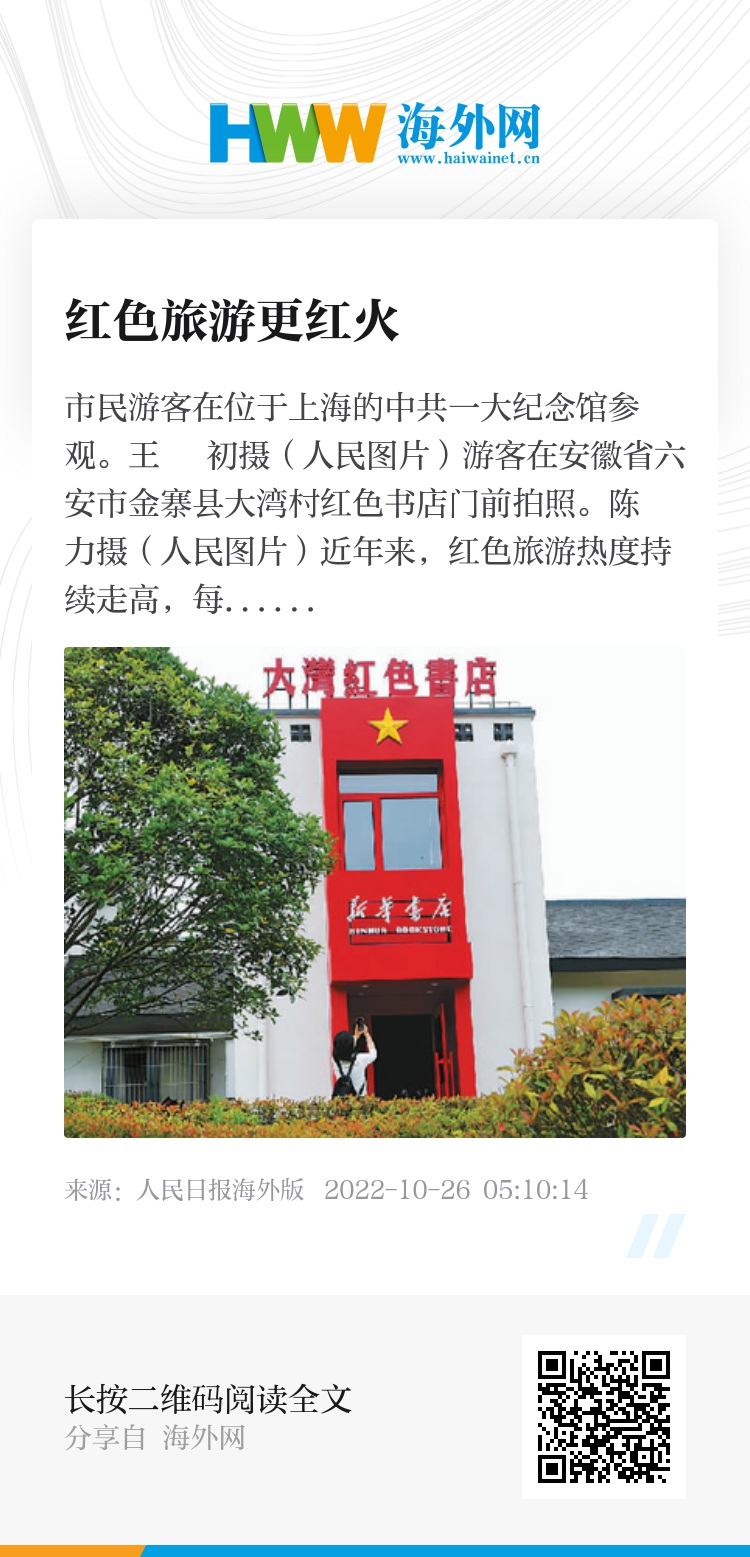激扬爱国情、喜迎二十大成为今年国庆休闲的底色。各地推出的打卡红色地标、探访红色旧址、缅怀革命先烈等红色旅游主题活动备受欢迎。在北京展览馆举办的“奋进新时代”主题成就展引发参观热潮。上海市历史博物馆举办《光明摇篮精神之源——迎“二十大”上海红色文物史料展》。湖北省红安县红色旅游景区内红旗飘飘,鄂豫皖苏区纪念园等红色景区游客接待量攀升。