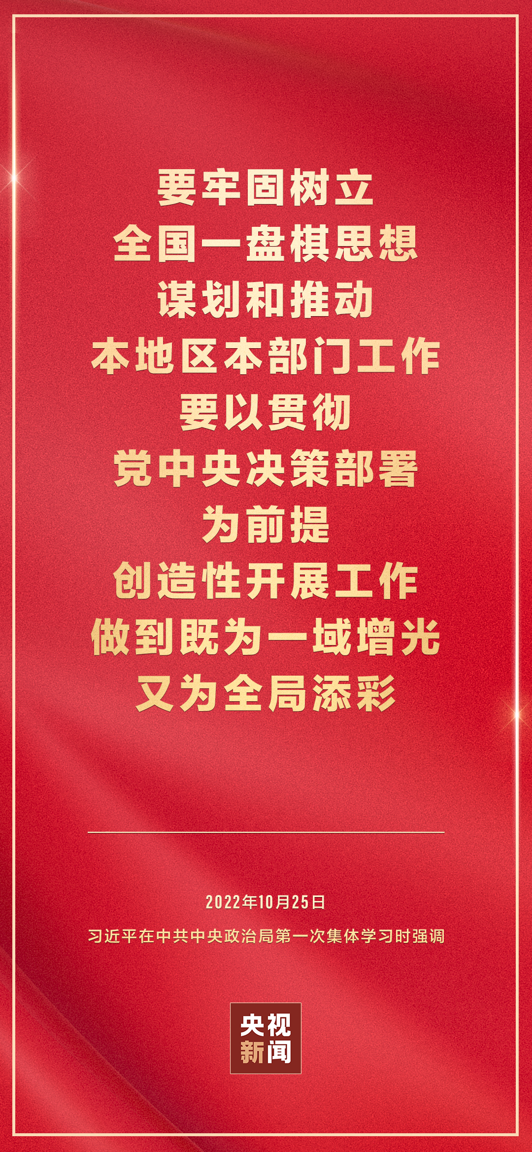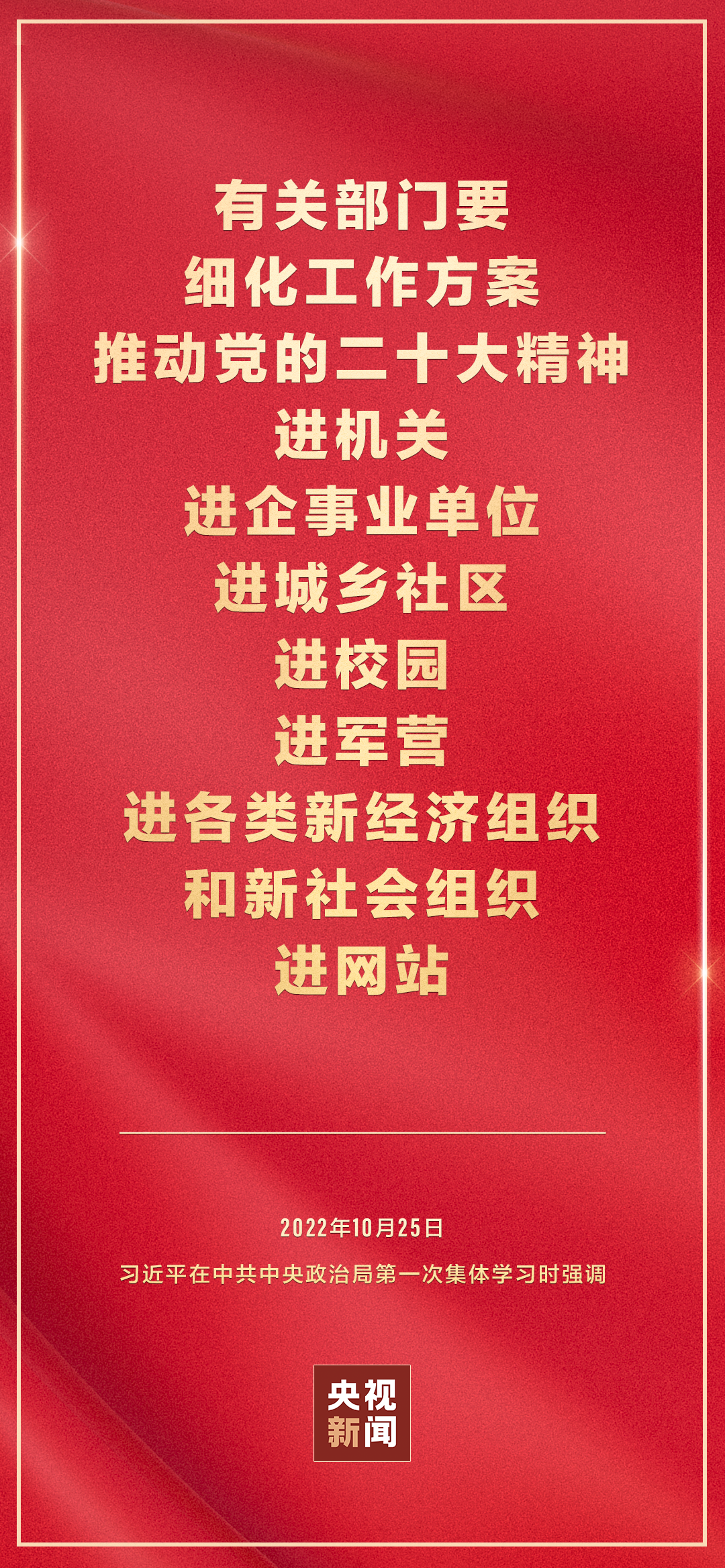 二十届中共中央政治局10月25日下午就学习贯彻党的二十大精神进行第一次集体学习。中共中央总书记习近平在主持学习时强调,全党要在全面学习、全面把握、全面落实上下功夫,坚定不移把党的二十大提出的目标任务落到实处,奋力夺取全面建设社会主义现代化国家新胜利。